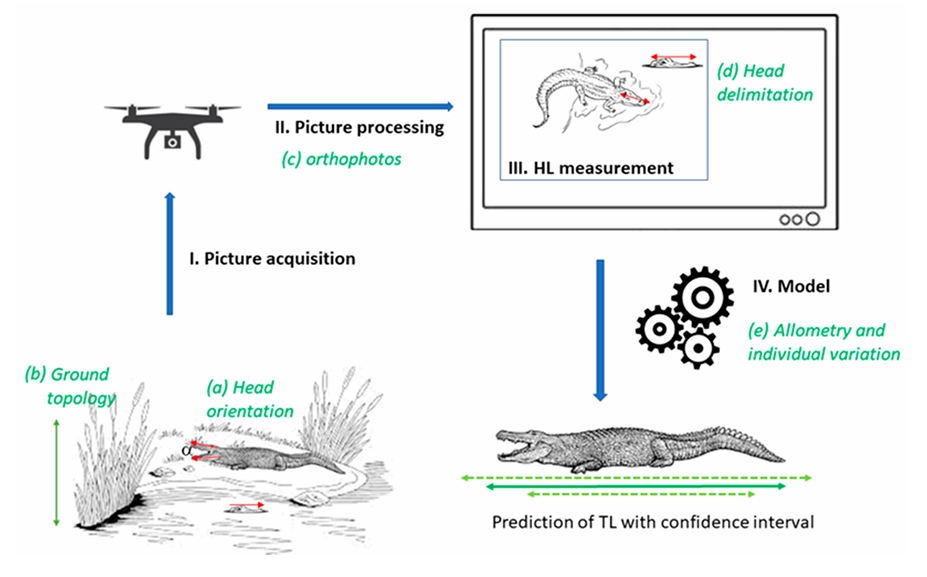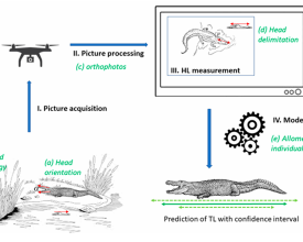 17종의 악어류에 대해 머리와 총 길이의 상관관계를 파악하기 위해 신뢰 구간을 통합하여 부정확한 원인(예: 측량 정확도, 머리 경사, 관찰자 편향, 지형 변동성)을 설명하는 측량 프레임워크가 개발되었으며, 이 방법은 드론 촬영을 통해 야생 악어에 적용되었습니다. 지형 효과는 사진측량 소프트웨어의 지상 표본 거리(GSD) 오류보다 영향이 적었습니다. 등척 프레임워크는 종에 따라 ≃11~18%의 정확도로 길이를 예측했으며, 개체 간의 자연적인 등척 변화가 이 범위의 대부분을 설명했습니다. 주관적이고 위험할 수 있는 기존 방법에 비해 드론 기반 접근 방식은 객관적이고 효율적이며 빠르고 저렴하고 비침습적이며 안전합니다.
